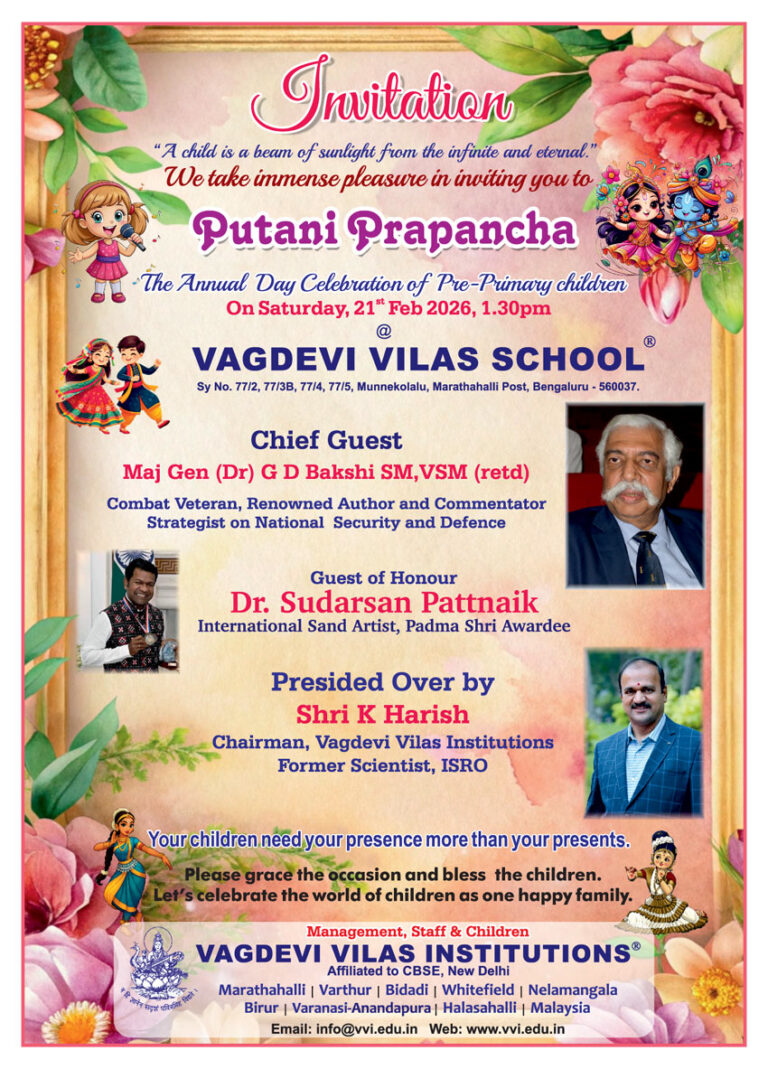 Dear parents, Welcome to the Vagdevi Vilas family. At Vagdevi Vilas, we believe that every human being ( vyakti) has a latent strength (shakti) which is waiting to be realized. A strength which is moving towards perfection.